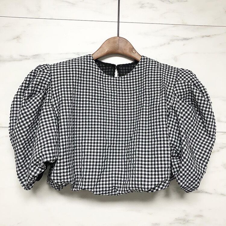 【セットアップ】ギンガムチェック柄 パフスリーブブラウス+マーメイドスカート
