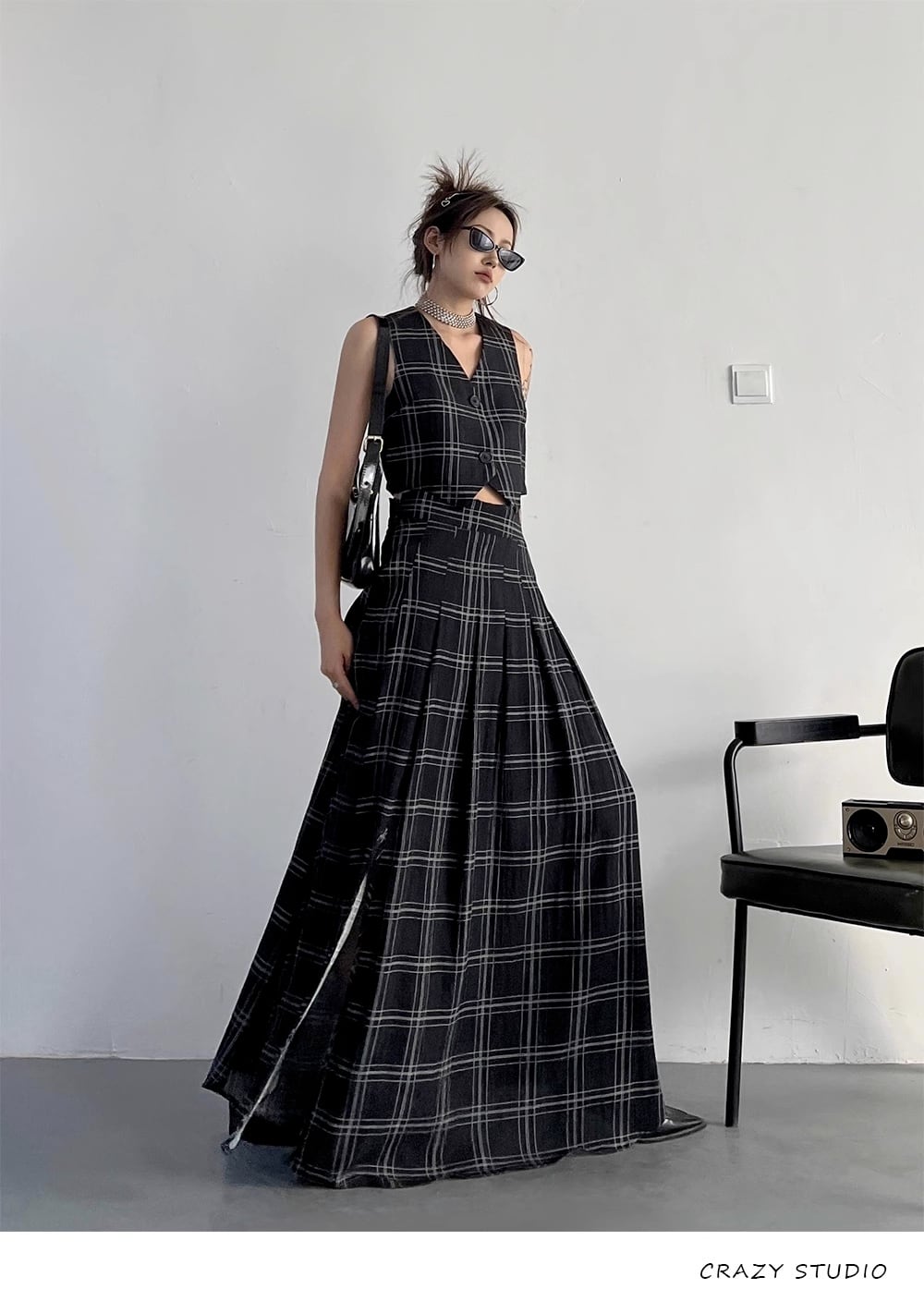 【セットアップ】チェック柄 ベスト+ロングスカート ジレ スカート ツーピース スリットスカート レディース トレンド カジュアル モード系 ストリート オシャレ 可愛い a4680