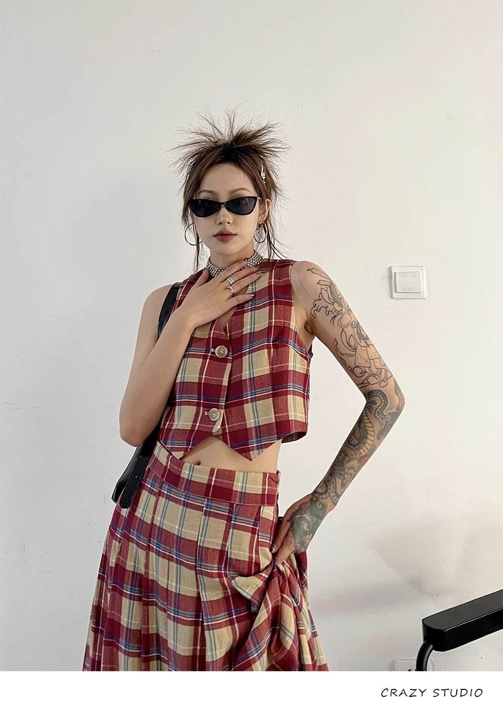 【セットアップ】チェック柄 ベスト+ロングスカート
