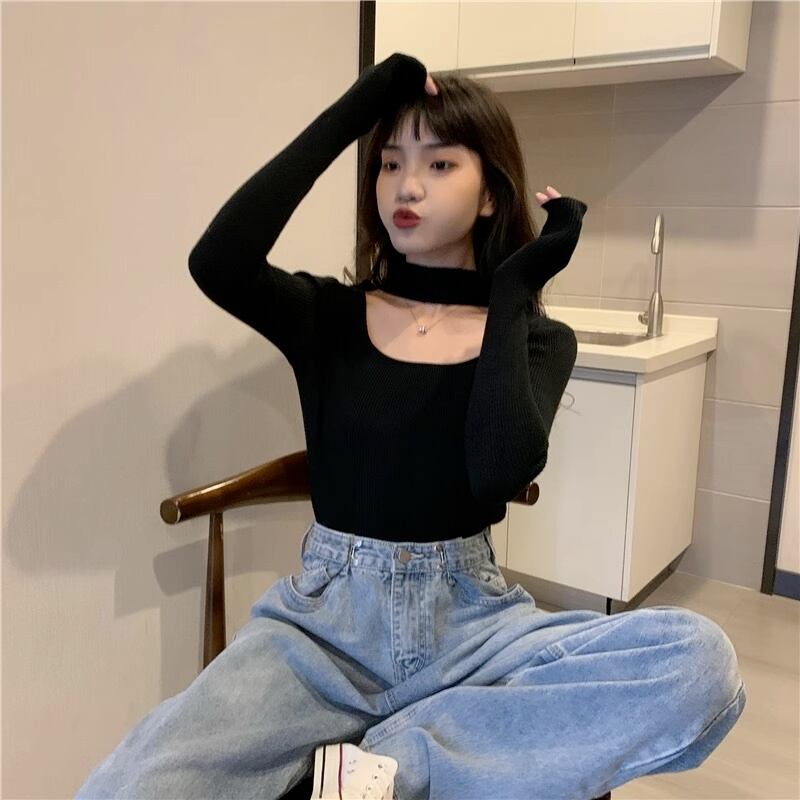 カットアウトリブニット ニット リブニット チョーカー風トップス リブTシャツ レディース 長袖 カットソー トレンド カジュアル モード系 ストリート オシャレ 可愛い a4714