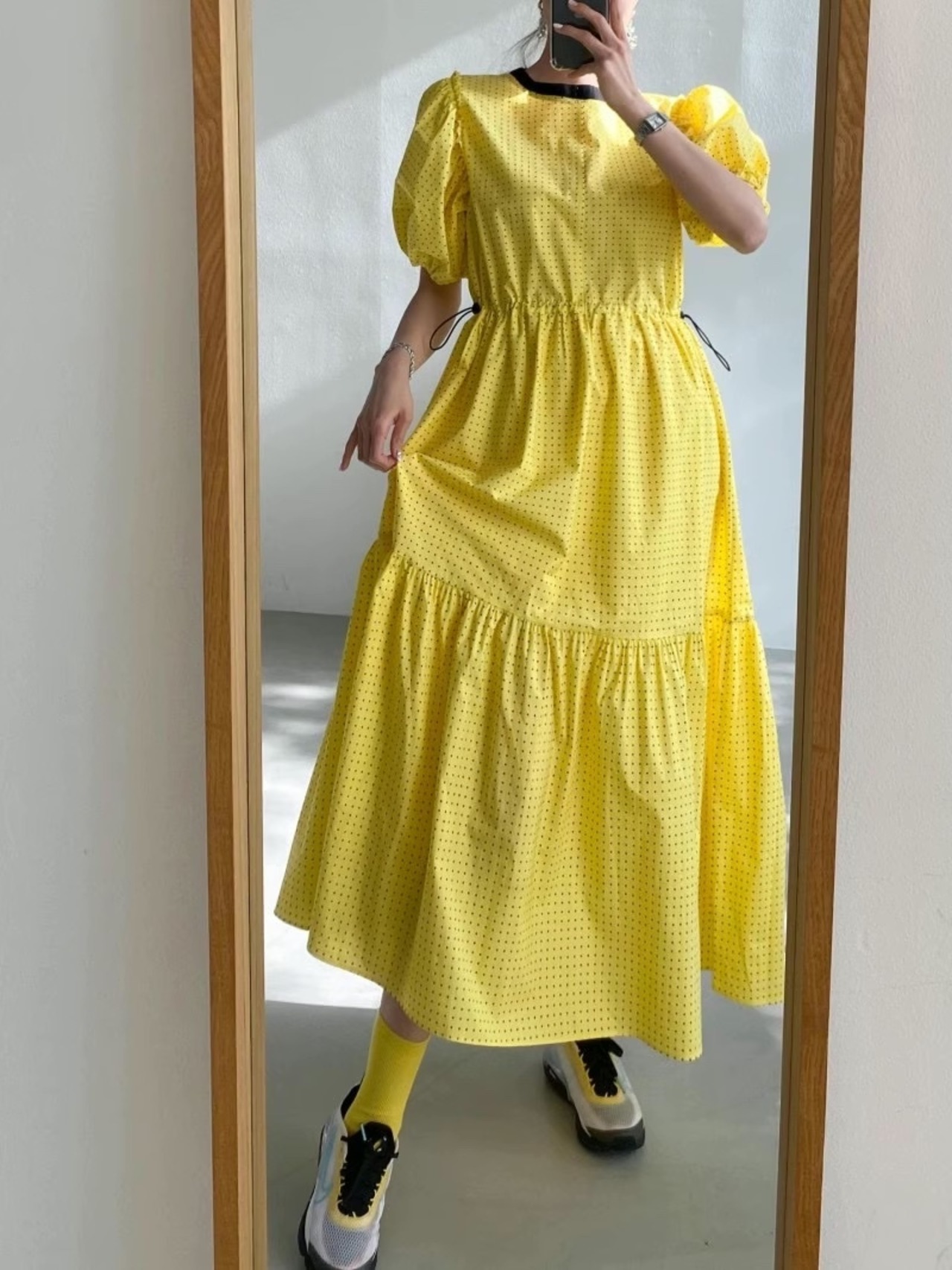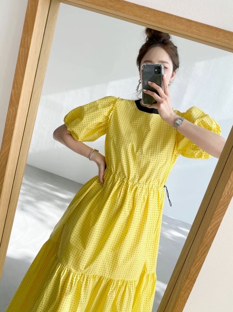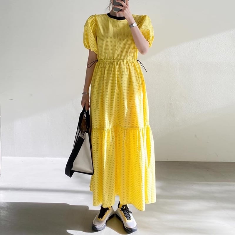 ドットパターンがキュート&モダンな雰囲気を醸し出しているロング丈のワンピース。
