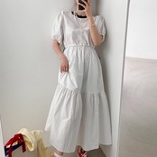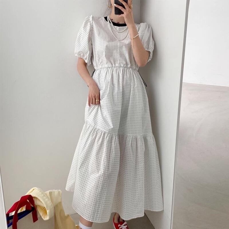 タイニードットティアードフレアワンピース ドット柄ワンピース フレアワンピース ティアードフレアワンピース ワンピース ドレス レディース ウエスト調整 半袖ワンピース ゆったり 韓国ファッション マタニティー C508