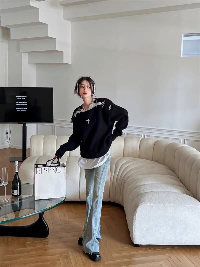 バックル付きセーター カットアウトニット トップス セーター ニット ルーズ 秋冬 オフショルダー ビッグネック Y2k 肌見せニット レディース 可愛い オシャレ a5032
